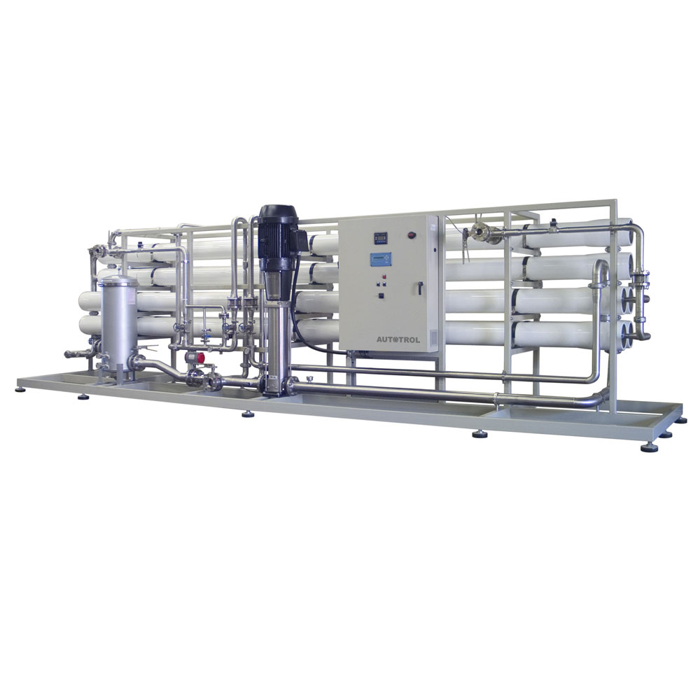 反滲透膜技術是當今國內外應用最廣泛的一種膜分離過濾技術,其原理是利用壓力差為動力,在高于溶液滲透壓的作用下,依據某些物質不能透過半透膜而將這些物質和水分離開來。由于反滲透膜的膜孔徑非常小(僅為10A左右),因此能夠有效地去除水中的溶解鹽類、膠體、微生物、有機物等,是目前純水及高純水設備中應用最廣泛的一種脫鹽技術。反滲透裝置由膜元件、儀表、管道、閥門、高壓泵、保安過濾器及控制盤柜和機架等組成的可獨立運行的成套單元膜設備。
